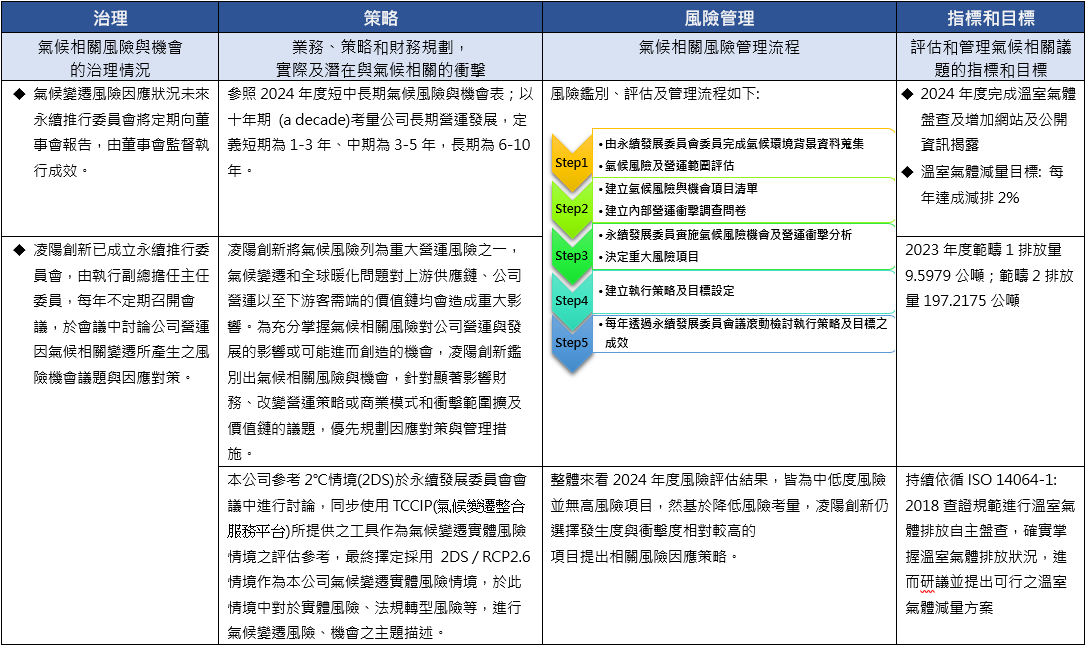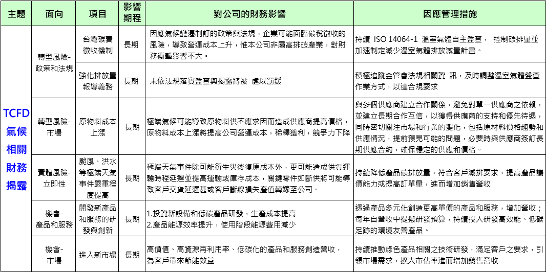 因應全球暖化導致的極端氣候,以及近年來能源及氣候變遷議題等影響性日趨重要,為減緩氣候變遷對公司營運衝擊,本公司依據氣候相關財務揭露建議(Task Force on Climate-related Financial Disclosures, TCFD)的架構,分為治理、策略、風險管理、指標和目標等,由高階管理階層就風險與機會之影響程度及發生頻度評分,針對轉型風險(政策與法規、技術、市場、名譽)、實體風險(立即性風險、長期性風險)及機會(資源效率、能源來源、產品/服務、市場、韌性)鑑別與描述對公司營運較相關之主題影響與因應策略,未來將每年定期向董事會報告,由董事會監控執行成效。