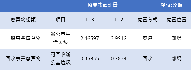 本公司無生產製造,廢棄物種類以一般事業廢棄物為主,主要為員工生活垃圾。分為一般垃圾(含廚餘)及資源回收類。同仁集中垃圾於暫存區,再由清潔人員協助再分類及清運。已依照法規管理廢棄物,避免因處理不當而造成違法疑慮或是污染環境的風險。同時也積極掌握各項環保法規動態,從源頭推動減量、落實資源回收再利用,以達到友善環境的實踐。